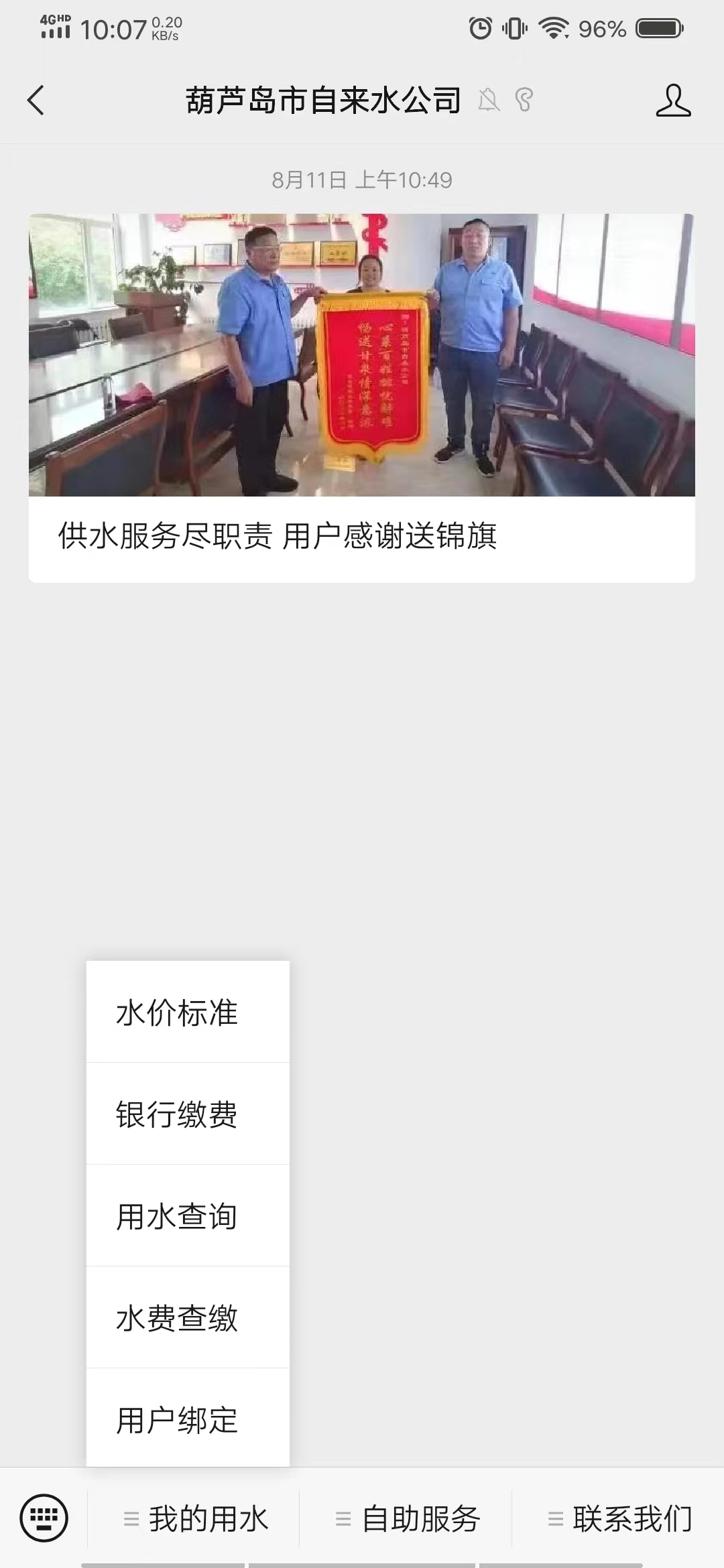 進(jìn)入葫蘆島市自來(lái)水公司公眾號(hào)—點(diǎn)擊我的用水—點(diǎn)擊水費(fèi)查繳