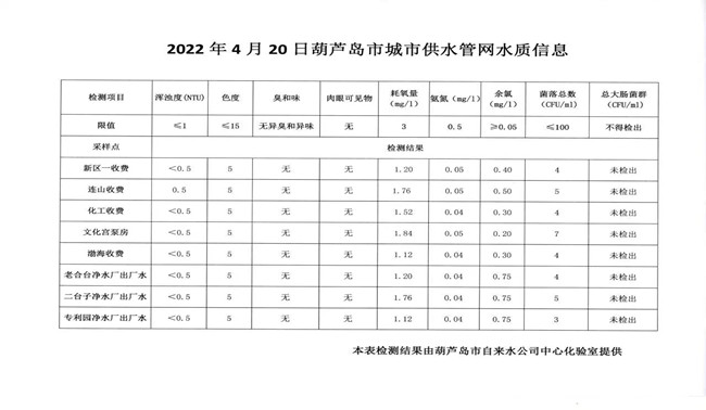 2022年4月20日葫蘆島市城市供水管網(wǎng)水質(zhì)信息