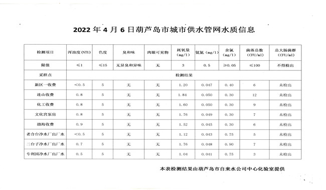 2022年4月6日葫蘆島市城市供水管網(wǎng)水質(zhì)信息