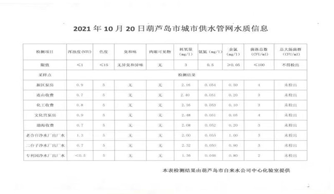 2021年10月20日葫蘆島市城市供水管網(wǎng)水質(zhì)信息