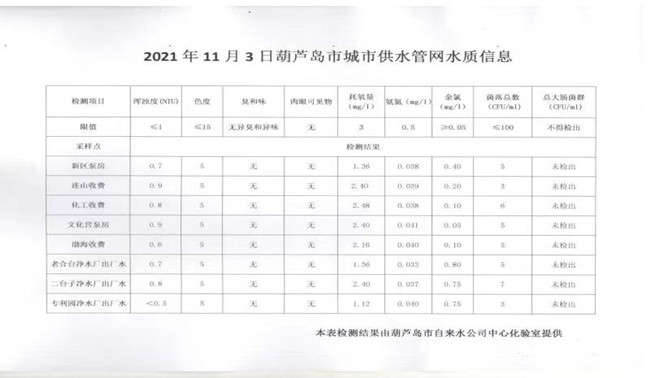 2021年11月3日葫蘆島市城市供水管網(wǎng)水質(zhì)信息