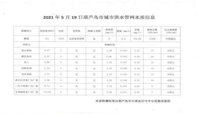 2021年5月19日葫蘆島市城市供水管網(wǎng)水質(zhì)信息