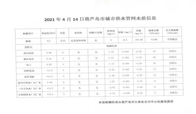 2021年4月14日葫蘆島市城市供水管網(wǎng)水質(zhì)信息
