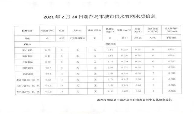 2021年2月24日葫蘆島市城市供水管網(wǎng)水質(zhì)信息