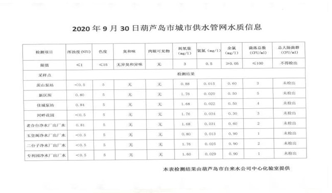 2020年9月30日葫蘆島市城市供水管網(wǎng)水質(zhì)信息