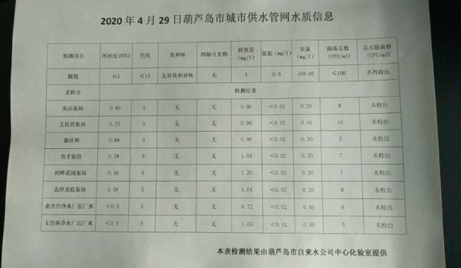 2020年4月29日葫蘆島市城市供水管網(wǎng)水質(zhì)信息