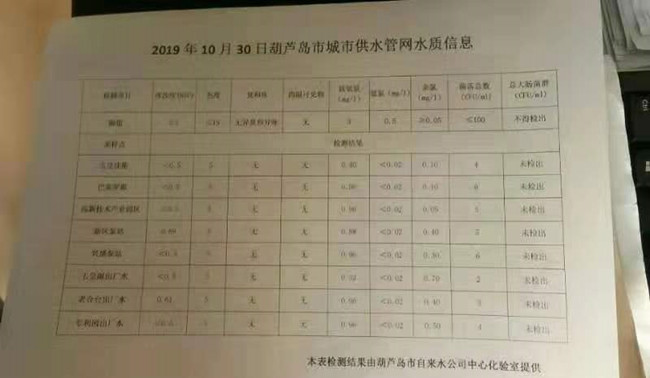 2019年10月30日葫蘆島市城市供水管網(wǎng)水質(zhì)信息