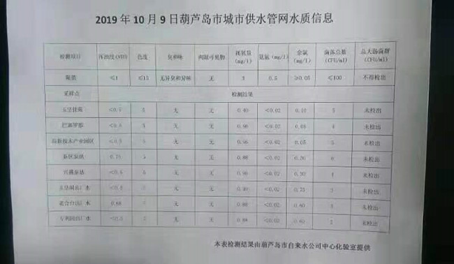 2019年10月9日葫蘆島市城市供水管網(wǎng)水質(zhì)信息