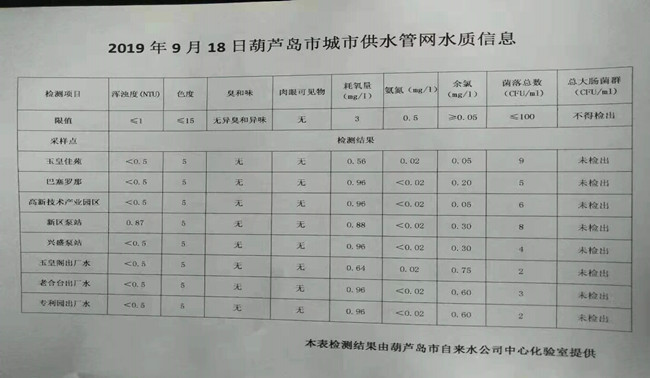 2019年9月18日葫蘆島市城市供水管網(wǎng)水質(zhì)信息