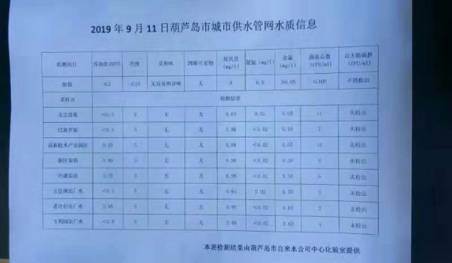 2019年9月11日葫蘆島市城市供水管網(wǎng)水質(zhì)信息