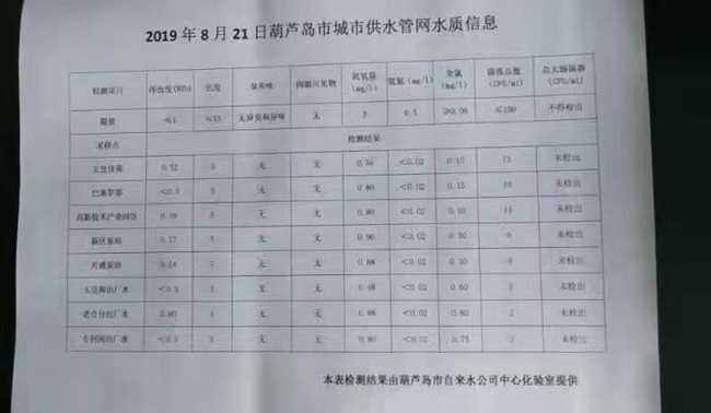 2019年8月21日葫蘆島市城市供水管網(wǎng)水質(zhì)信息