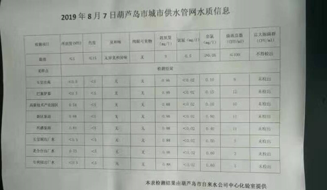 2019年8月7日葫蘆島市城市供水管網(wǎng)水質(zhì)信息