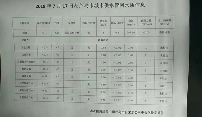 2019年7月17日葫蘆島市城市供水管網(wǎng)水質(zhì)信息