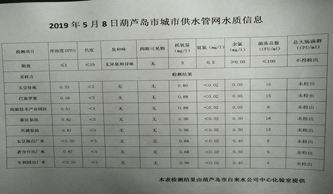 2019年5月8日葫蘆島市城市供水管網水質信息