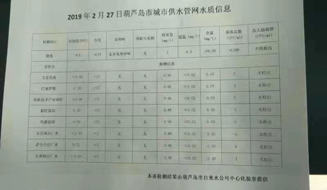 2019年2月27日葫蘆島市城市供水管網(wǎng)水質(zhì)信息