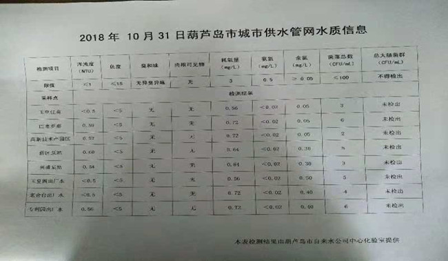 2018年10月31日葫蘆島市城市供水管網(wǎng)水質(zhì)信息