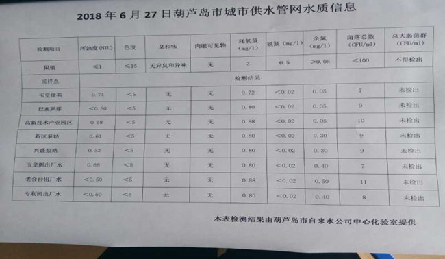 2018年6月27日葫蘆島市城市供水管網(wǎng)水質(zhì)信息