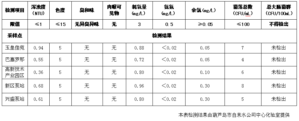2017年1月25日葫蘆島市城市供水管網(wǎng)水質(zhì)信息