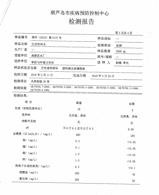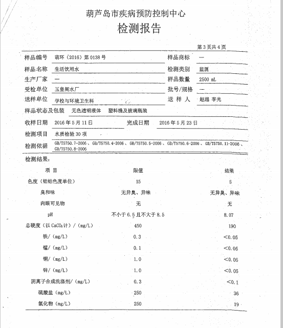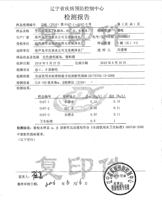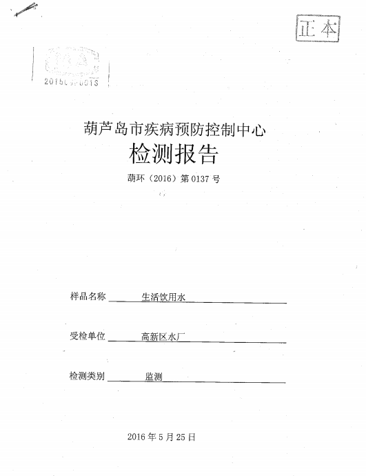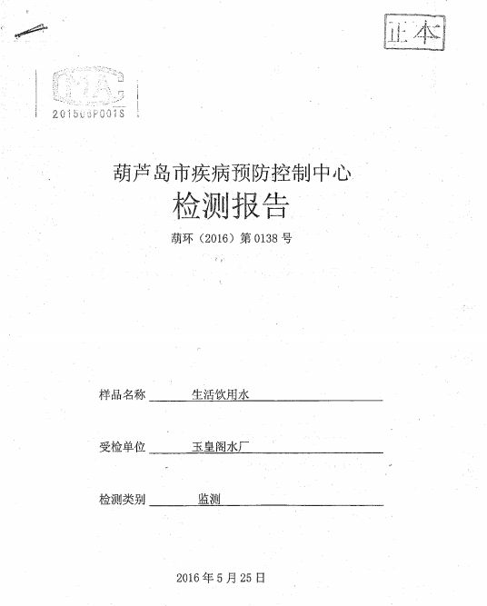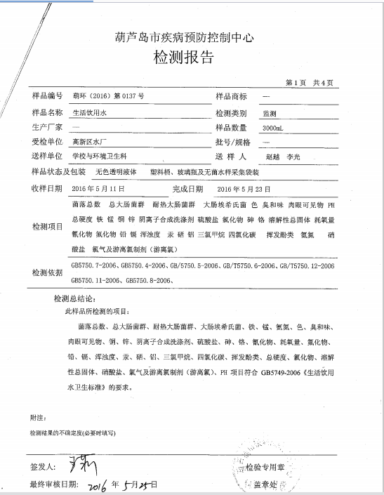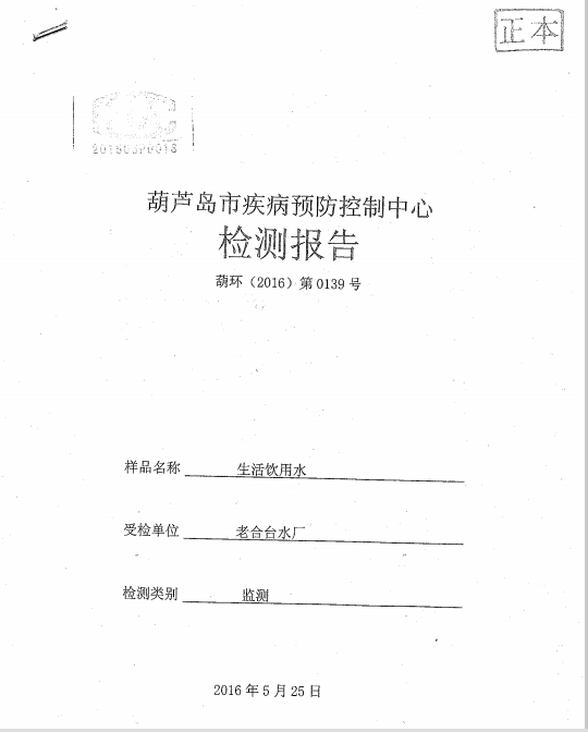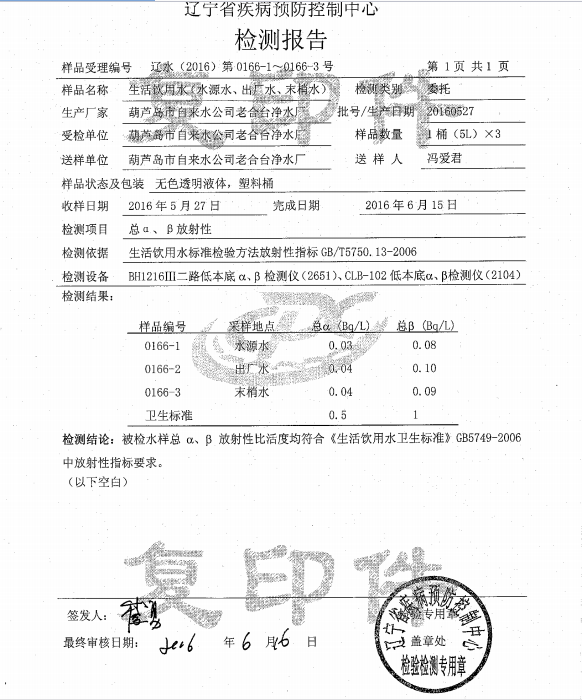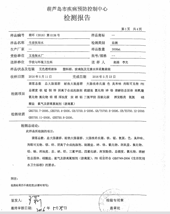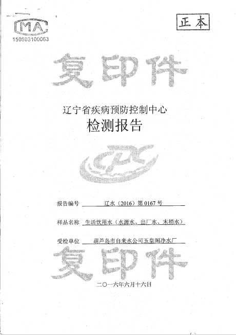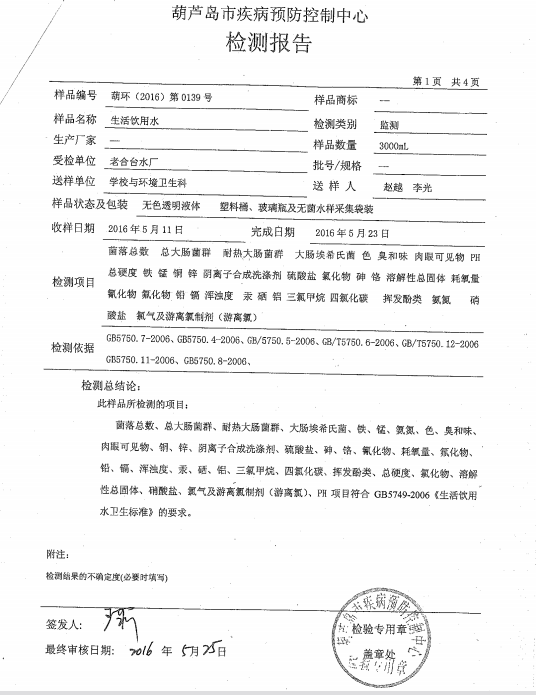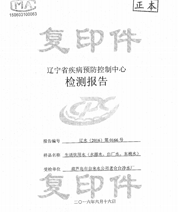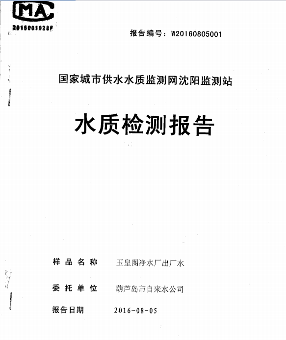 葫蘆島市自來(lái)水公司2016年水質(zhì)檢測(cè)報(bào)告公示